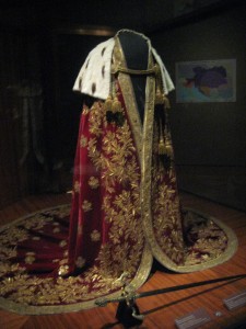 We visited the Imperial Apartments and the Treasury. Morbid highlights include pieces of the actual crucifixion cross and the spear that pierced Jesus. Oh yeah – and the pieces encased in gold are supposed to be the nail that went into his right hand. The other items in the gold case are seals of approval by Pope Innocent (we think the VIII but can’t entirely remember from the audioguide that we were listening to). None of the descriptions were in English so it could be a little challenging to keep up with it all. Thought you guys might find these interesting. I thought it most fascinating that all were collected by the Habsburg family – ranging in time from the 1100s to the 1600s (yes, just a few years after the actual action took place)… 😉